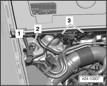 - Remove the bolts - 1 - and - 3 - and the tower brace - 2 -.