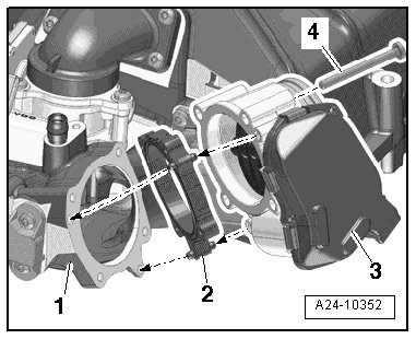 - Install the throttle valve control module - 3 - on the intermediate flange - right arrows -.