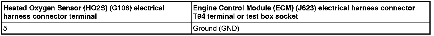 - Using a multimeter, check the Heated Oxygen Sensor (HO2S) (G108) electrical harness connector terminal 5 to Ground (GND) for voltage.