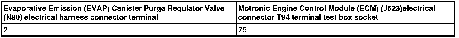 - Using a multimeter, check the Evaporative Emission (EVAP) Canister Purge Regulator Valve (N80) electrical connector terminal 2 to Motronic Engine Control Module (ECM) (J623) electrical connector T94 terminal 75 for an open circuit.