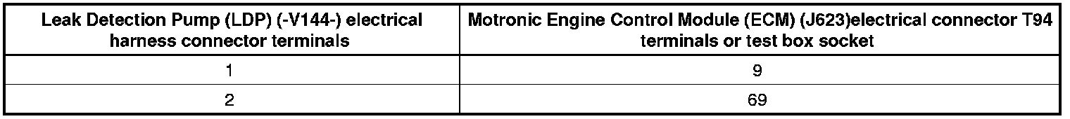 - Using a multimeter, check the Leak Detection Pump (LDP) (-V144-) electrical connector terminals to Motronic Engine Control Module (ECM) (J623) electrical connector T94.