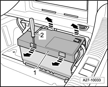 - Release the retaining clips - arrows - with a screwdriver - 2 - and remove the cover - 1 -.