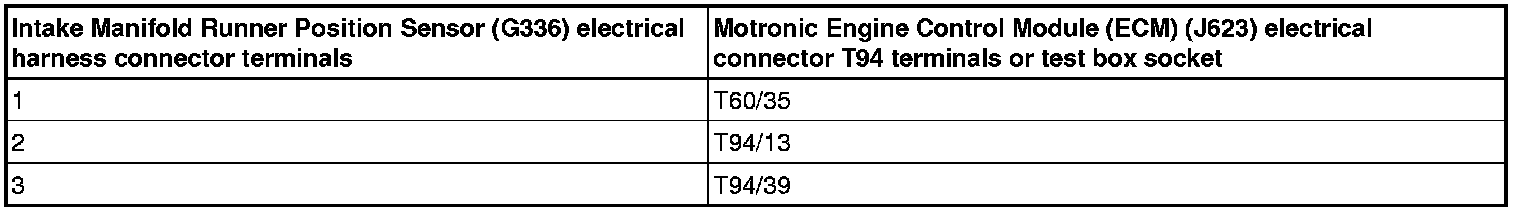 - Using a multimeter, check the Intake Manifold Runner Position Sensor (G336) electrical harness connector terminals to the Motronic Engine Control Module (ECM) (J623) electrical harness connector T94 terminals for an open circuit.