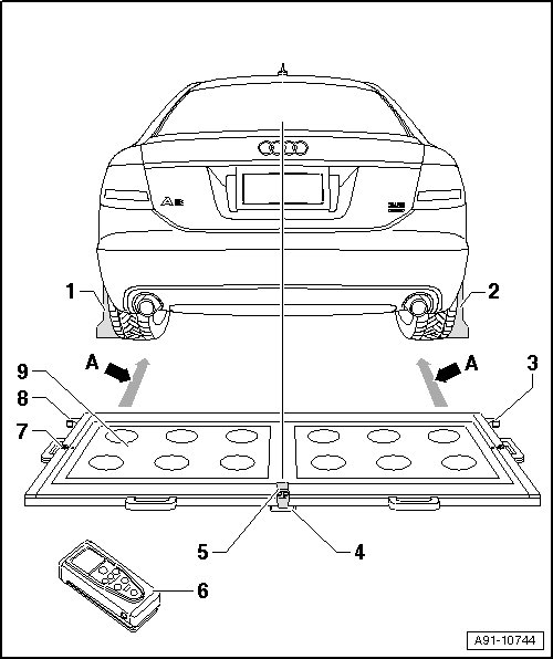 - Position the calibration device behind the vehicle, 1.47 to 1.9 meters from the rear wheels, refer to - dimension A - in the overview, Sedan /Avant.