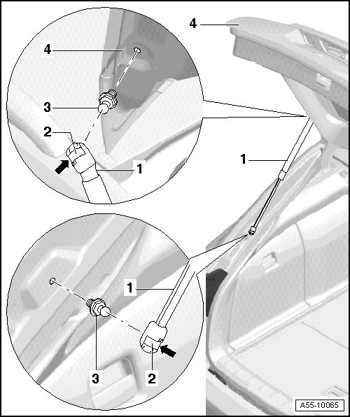 • Using screwdriver, lift retaining spring - 2 - as shown and remove gas-filled strut - 1 - from upper ball stud - 3 -.