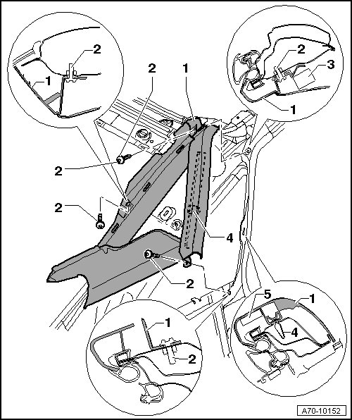 - Carefully remove C-pillar trim - 1 - under side curtain airbag - 3 -.