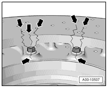 If the ceramic brake disc has cracks near the threaded connectors on the cup leading to the friction surface on the brake disc - arrows -, then the brake discs must be replaced.