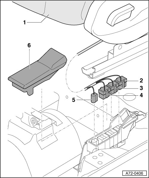 - Press in tab on airbag connector for heated seat - 3 - on tunnel side and disconnect connector for heated seat - 3 -.