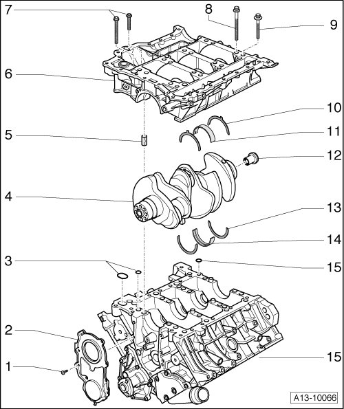 On engines through no. AUK 028 000 or BKH 033 000 another allocation of letters on crankshaft to bearing shell color applies to bearing 1 (front).