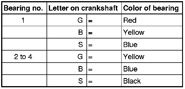 Bearing shells with the correct thickness are allocated to the cylinder block in the factory. Colored dots on sides of bearing shells serve for identifying bearing shell thickness.