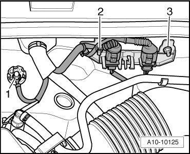 - Remove the air filter lower section and disconnect the connector - 2 - on the rear side at the Intake Air Switch-Over Valve (N335).