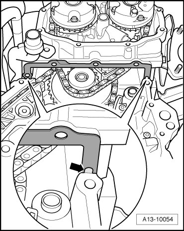 - Fill the cleaned holes - arrow - in the cylinder head seal with sealant.