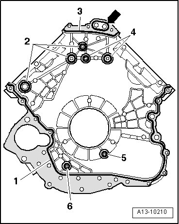 - Apply sealant beads - 1 to 6 - on clean sealing surfaces of lower timing chain cover, as shown in illustration.