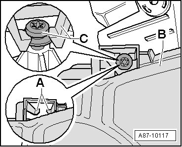 • In model year 2005, the footwell vent - B - air duct mount was changed (gradual introduction). The upper bolt - C - no longer has to be removed, the air duct clips in place via retaining tabs - A -.