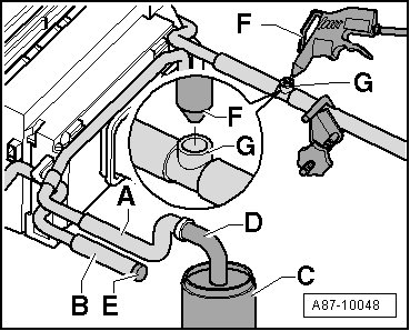 - Close the coolant hose - B - (e.g. with a sealing plug - E -).