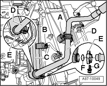 - Remove the holder - A - for coolant pipes - D - and - E -.