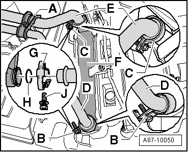 - Connect the section of hose - D - (extension) to the coolant hose - A -.