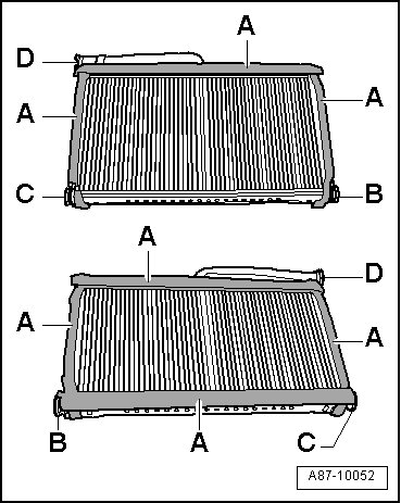 • There are different versions of the heater core and the associated coolant pipes. In model year 2006, the seal between connections on the heat exchanger and coolant pipes was converted from an axial/radial seal - A - and - B - to a radial seal - D - and - E - (rolling change), make sure the version is correct when replacing the heat exchanger.