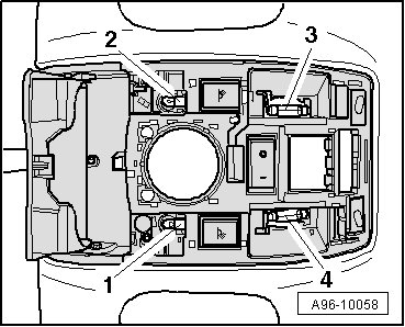 - Open eyeglass compartment - 1 - and release center covers - 2 - and - 3 - of interior/reading light - arrow -.