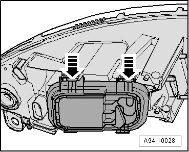- Release securing guides - arrows - and remove headlamp housing cover.