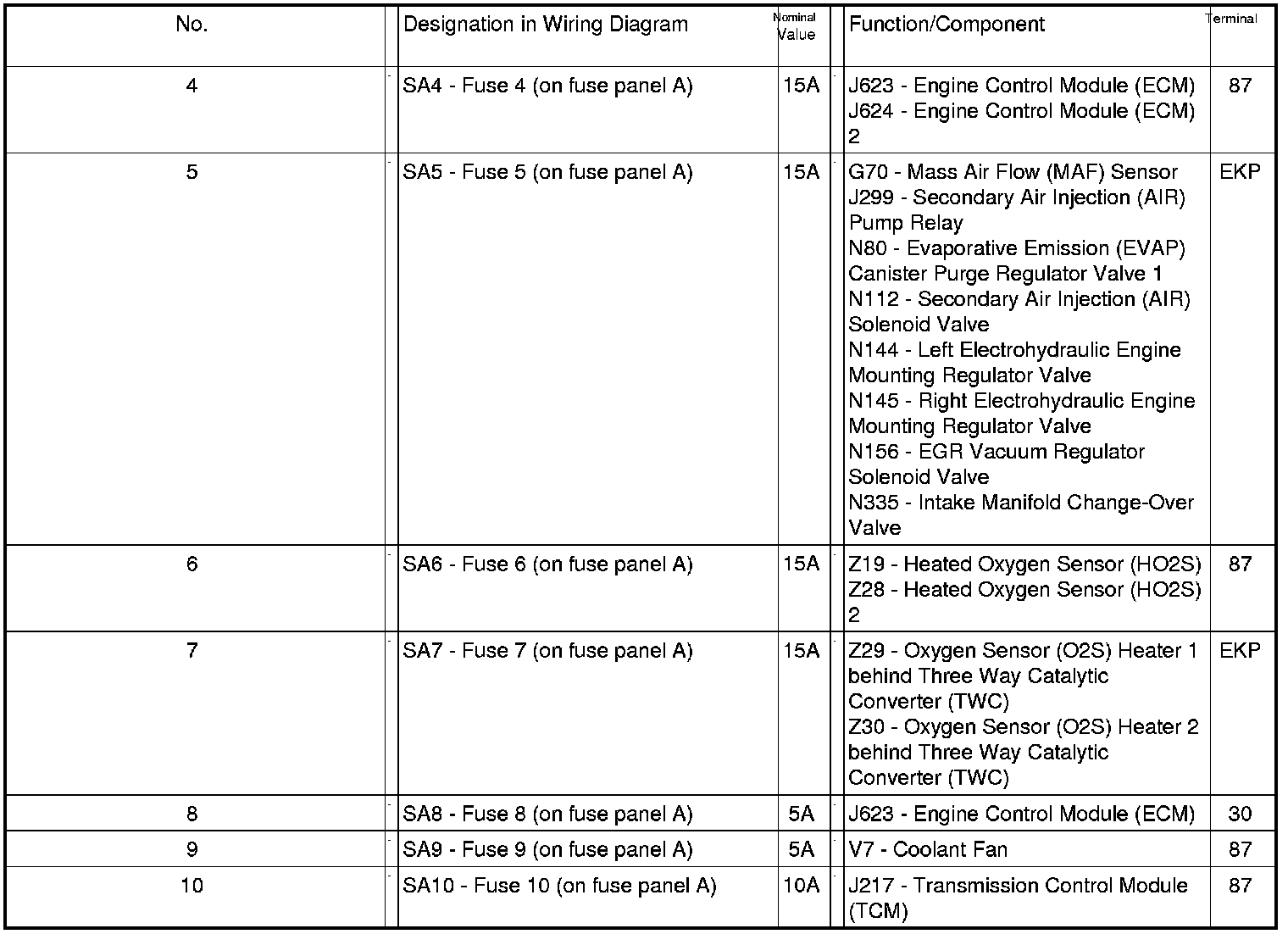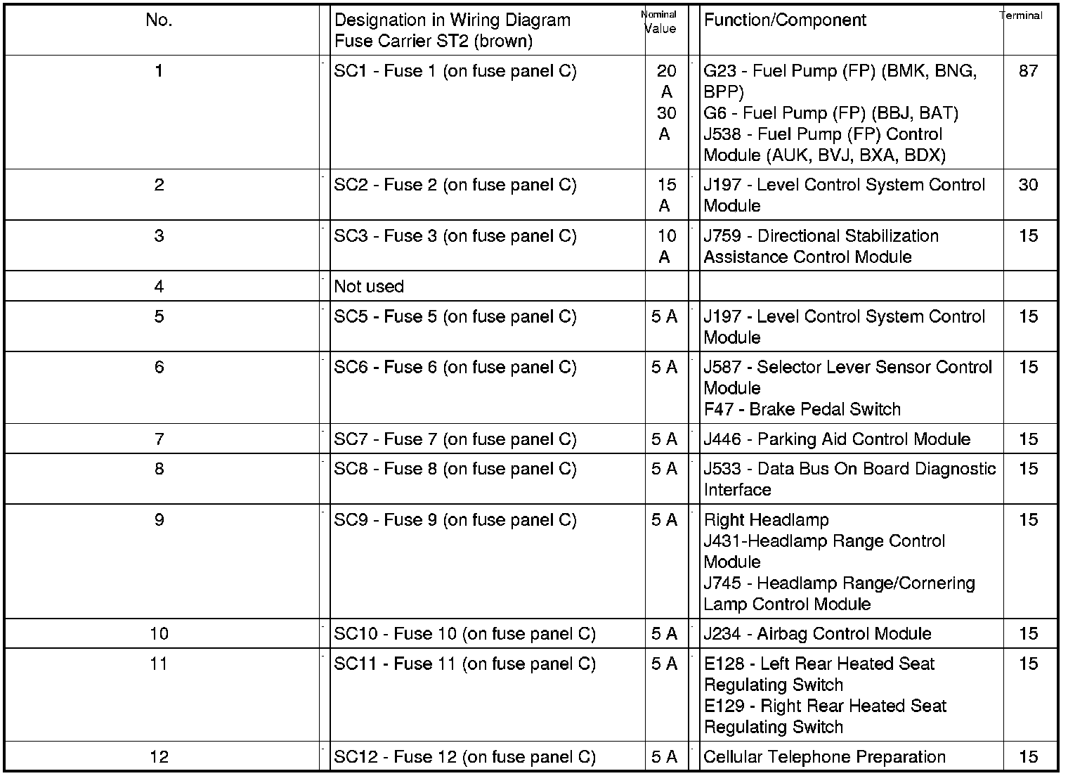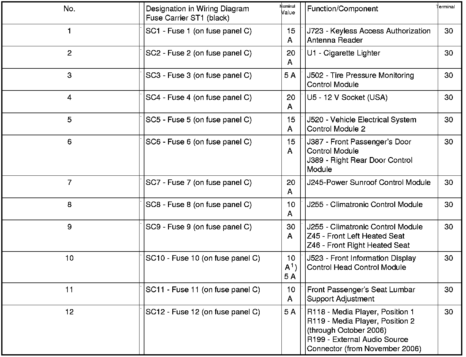 Position of Fuses On Fuse Panel (LHD), from MY 2007