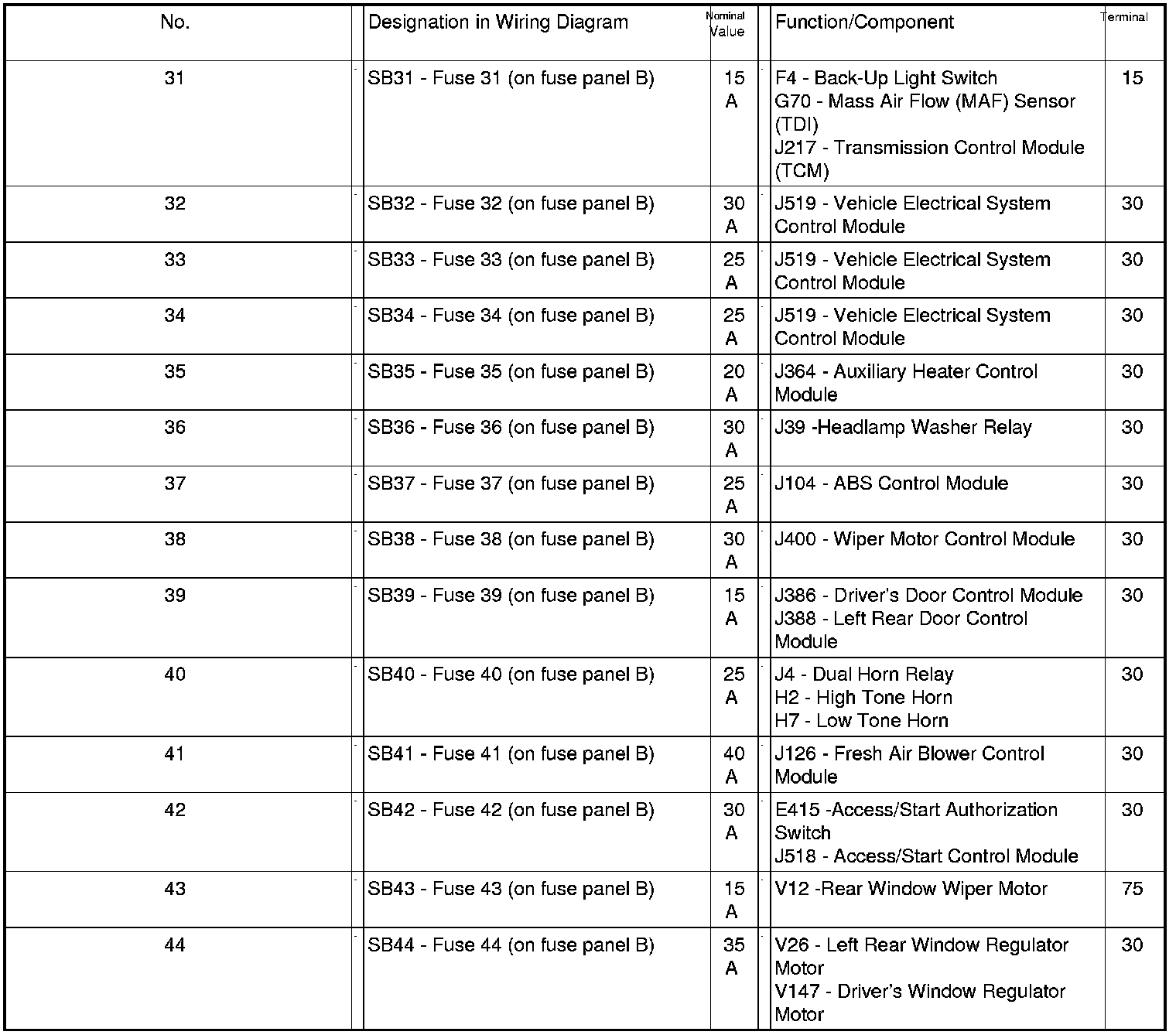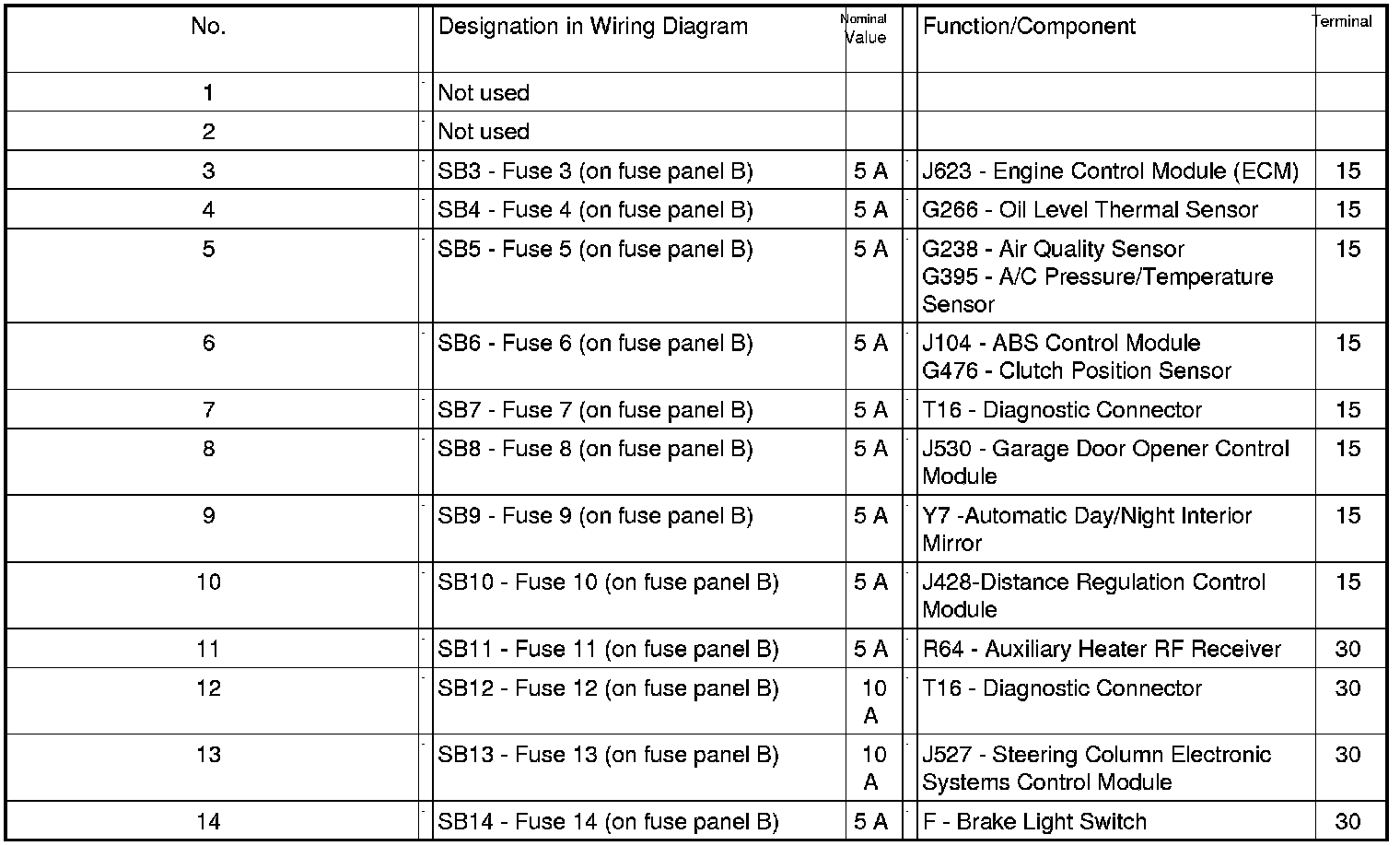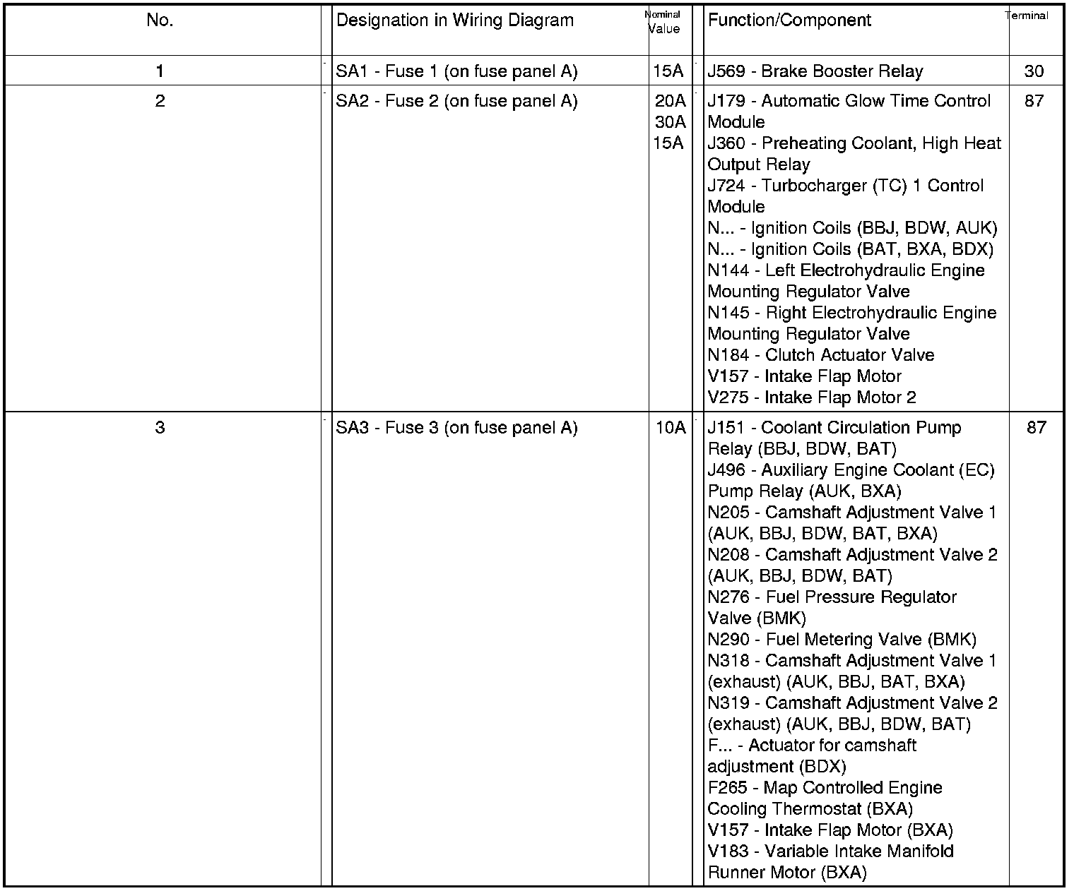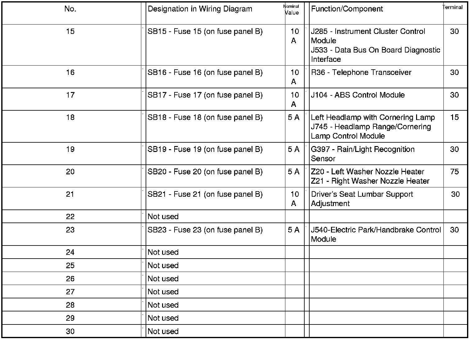 Position of Fuses On Fuse Panel (LHD), from MY 2007