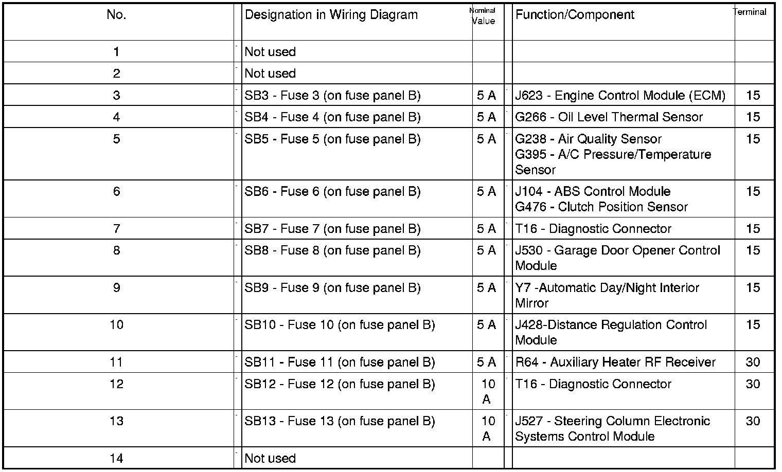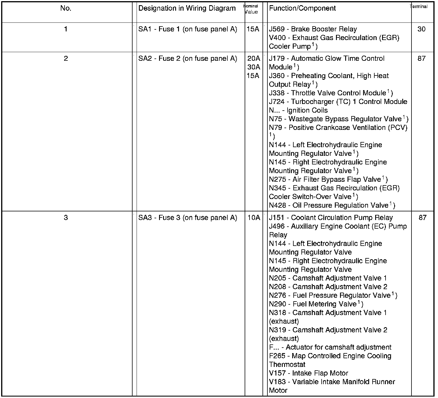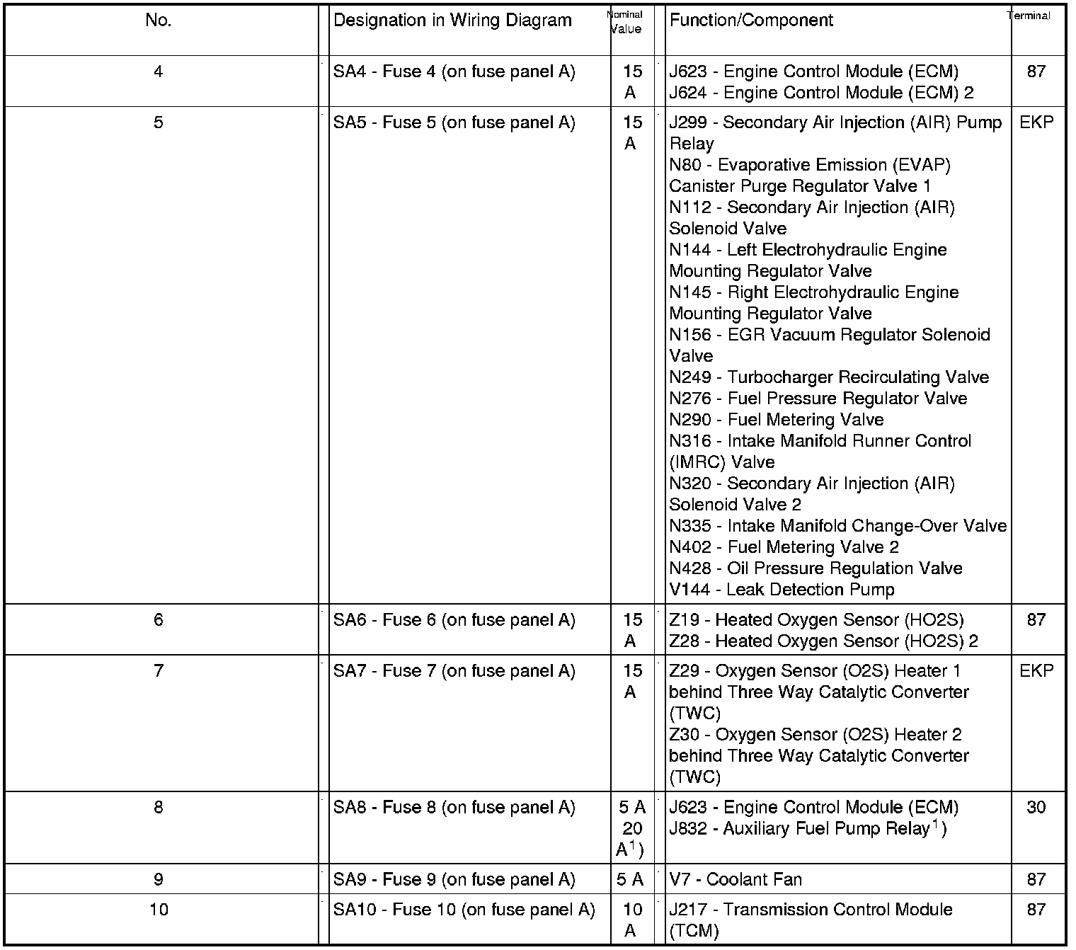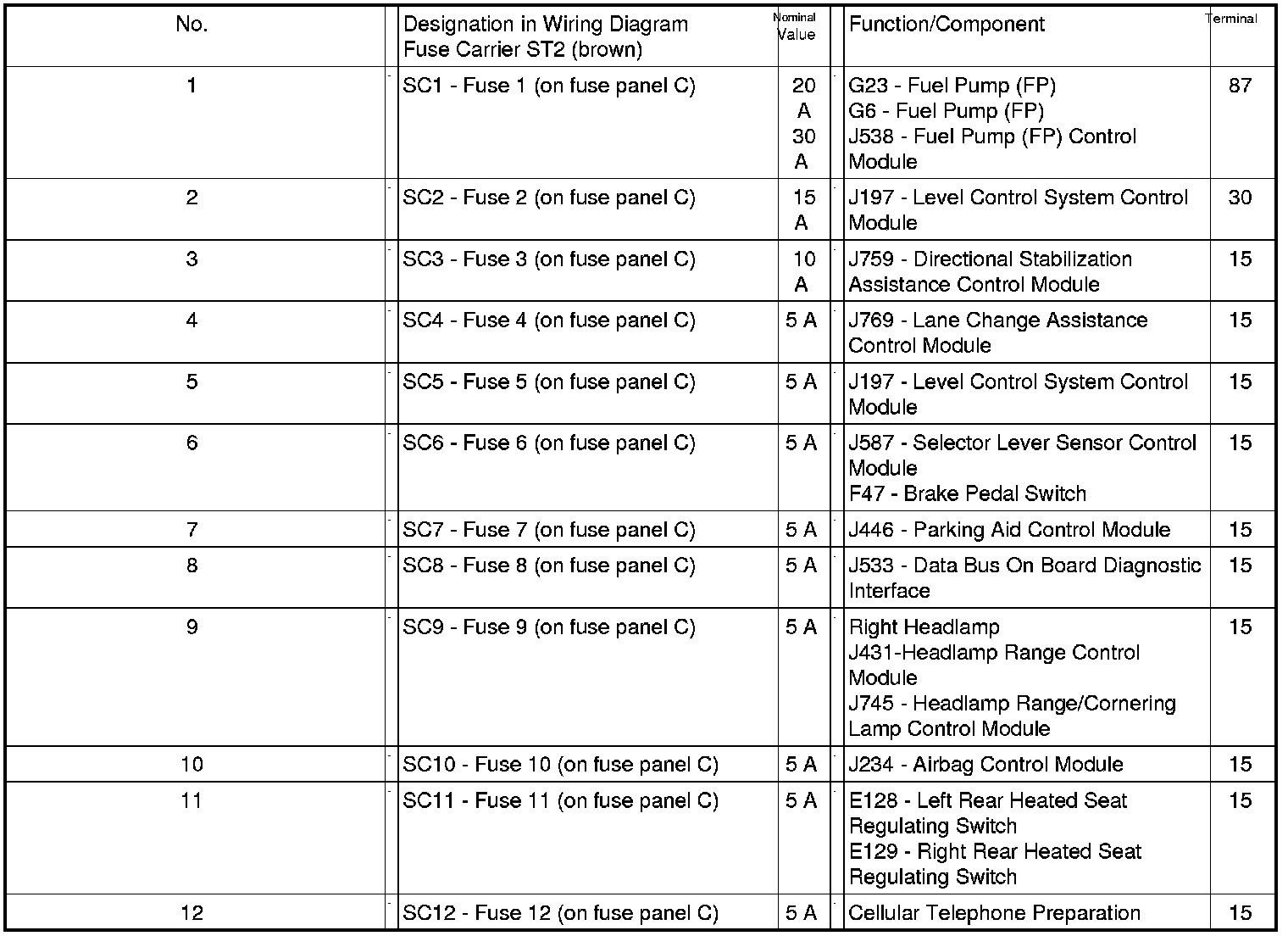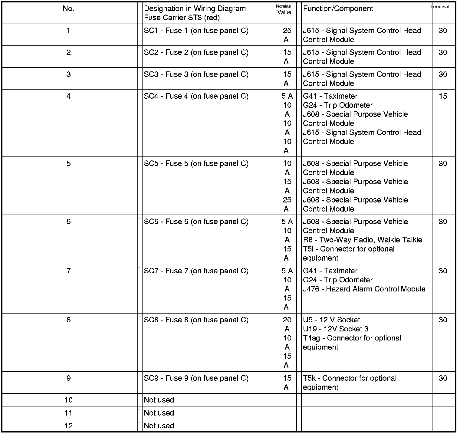 Position of Fuses On Fuse Panel (LHD), from MY 2009