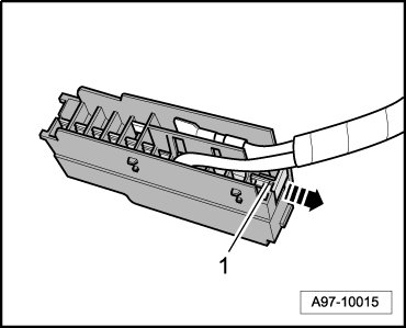 - Pull off retaining strip - 1 - for harness connectors - arrow - and remove harness connectors from connector socket.