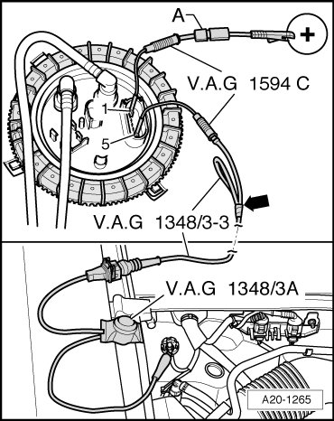 - Connect remote control (V.A.G 1348/3A) with adapter cable (V.A.G 1348/3-3) with an adapter cable from connector test set (V.A.G 1594C) at terminal - 5 -.