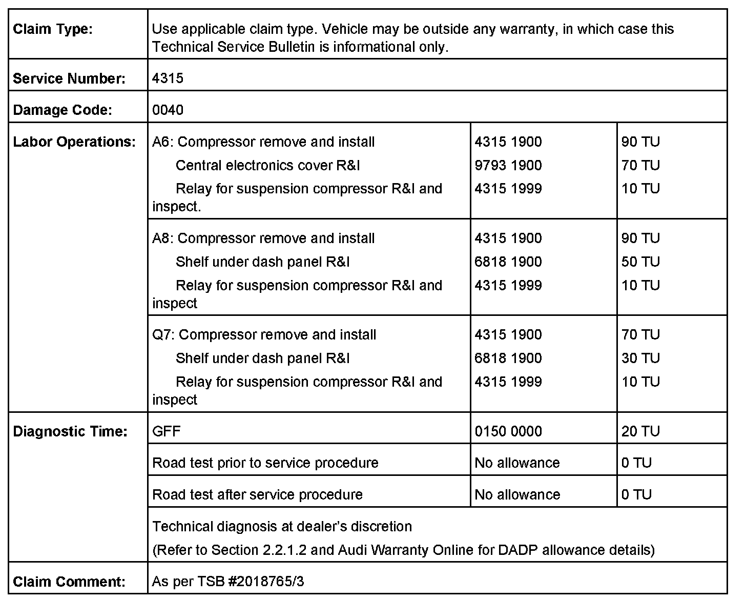 All warranty claims submitted for payment must be in accordance with the Audi Warranty Policies and Procedures Manual. Claims are subject to review or audit by Audi Warranty.