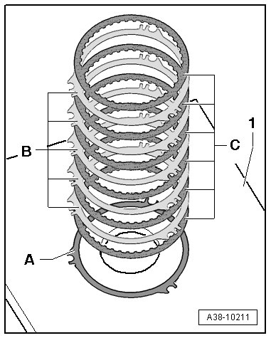 - Then, alternating with the same direction for each lining disc - C - (6 pieces) and place an outer disc - B - ( 5 pieces) on the corrugated spring washer.