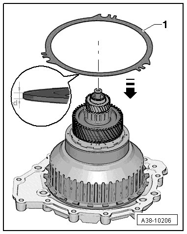 • The outer disc - 1 - comes onto the piston of the reverse gear clutch through this. Through the flat outer disc, a correct measurement can be performed on the highest position of the piston. The thickness - d - of the outer disc - 1 - will be subtracted later to determine the amount of the piston.