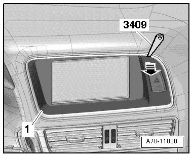 - Pry the MMI screen cover - 1 - out at the corners - arrow - using the (3409) and remove it.