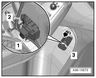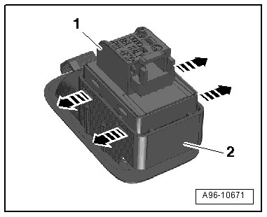 - Release the retaining clip - 2 - and press the trim - 3 - with the rear lid remote unlock switch out of the door trim in the direction of the - arrow -.