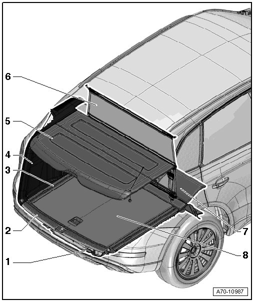 • Equipment level, luggage compartment floor with retaining track, overview. Refer to => [ Luggage Compartment Floor with Rail Overview ] Luggage Compartment Floor With Rail Overview.