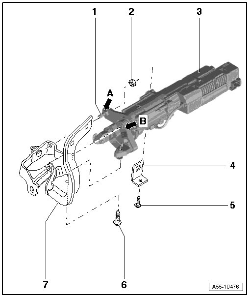 • When installing, insert sideways with socket - arrow B - and loose eccentric bolts - arrow A - in hinge.