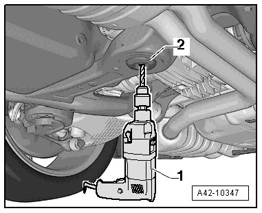- Position the drill - 1 - on the bonded rubber bushing - 2 - as illustrated and drill the hole in several steps.