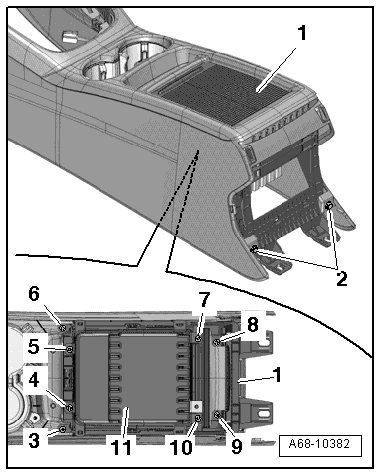 - Remove the screws - 3 through 10 - and remove the storage compartment - 11 -.