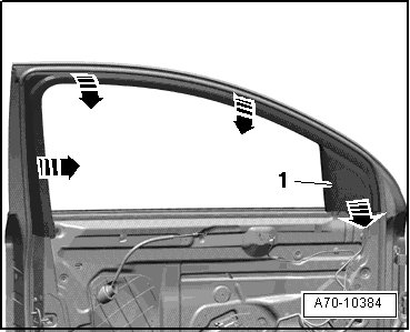 - Install the window frame trim - 1 - into the window guide - 2 - starting on the inside at the bottom - arrow -.