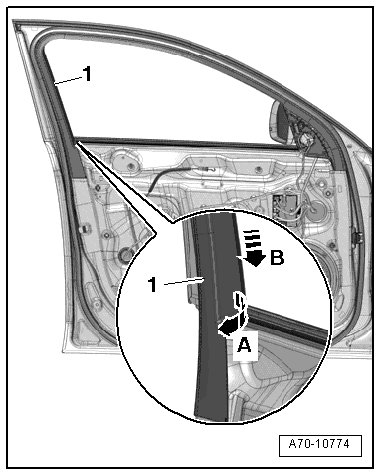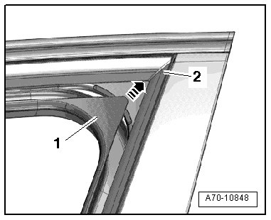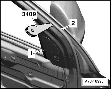 - Pull the (3409) the entire length between the window frame trim - 1 - and door seal molding - 2 - and at the same time push the door frame trim toward the door frame.