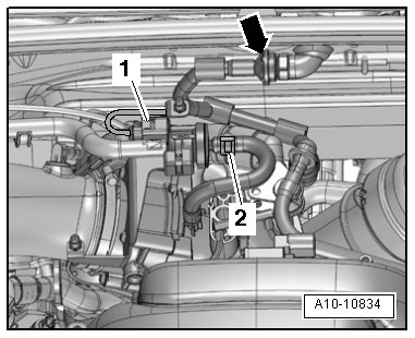 - Press retaining tab - 2 - up slightly and disconnect the crankcase ventilation hose from the intake manifold.