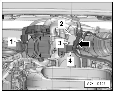 - Remove air guide hose by loosening the hose clamp - 3 - and opening the clips - arrows -.