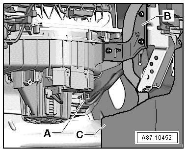 - Check the evaporator - A - and the air guide in the A/C leading to the evaporator - B - for dirt and clean is necessary.