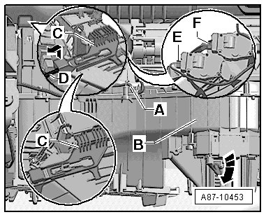 • Make sure then both control motors, the airflow door motor (V71) and the recirculation door motor (V113) are connected correctly. Check the activation using the "A/C output diagnostic test mode". When the glove compartment is removed, the air recirculation door - F - is visible. Refer to Vehicle Diagnostic Tester in "Guided Fault Finding" function.