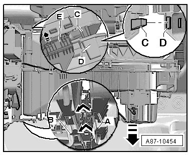 - Lift the air intake housing to the right far enough so that the upper A/C strap - C - fits into the air intake housing bracket - D - and then press both parts together.