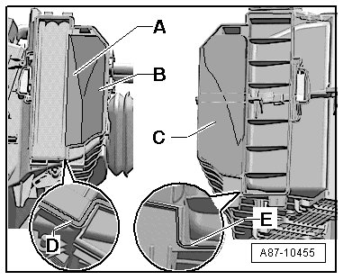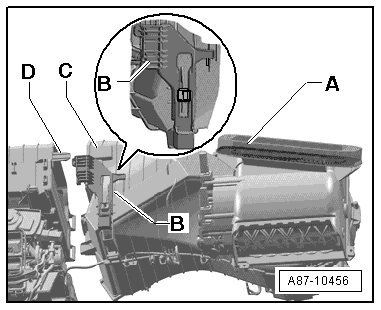 - Check the position of the lock, only if the latch - B - is in the position shown, can the air intake housing - C - and the A/C - D - be joined together.