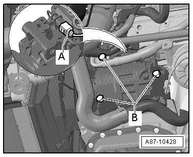 - Remove the A/C compressor bolt - B -.