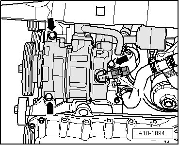 - Before tightening the A/C compressor, check seating of both alignment bushings - A - in bracket or A/C compressor - B -.