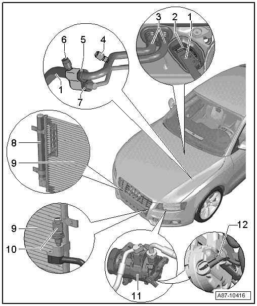 • The following illustration shows the location of the components on an Audi A5 Coupe; the Audi Q5 location of the components varies slightly. The description of the components is not different; removing and installing is performed in the same way as on the Audi A5 Coupe