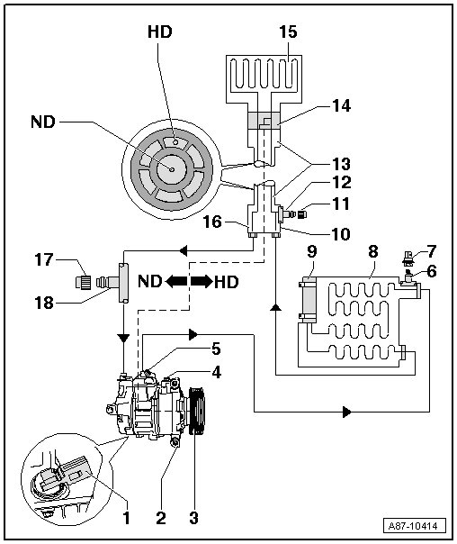 Refrigerant circuit components not identified with 1) cannot be serviced or replaced by all workshops. This also applies to all refrigerant hoses and refrigerant lines. Components not identified with 1) can only be serviced or replaced by a workshop that has all the necessary equipment and tools. In these workshops only trained technicians may perform this work. The refrigerant circuit must be drained.